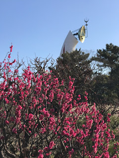 入社以来、25年間、毎年参加していますが、朝一番に見る太陽の塔と梅の花との